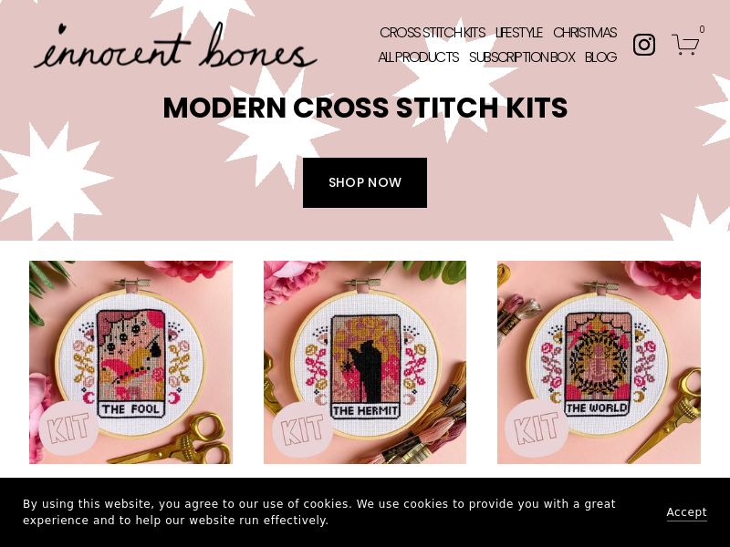 Modern and alternative cross stitch kits and craft gifts to get you in the creative mood. Learn to cross stitch with an Innocent Bones embroidery kit.